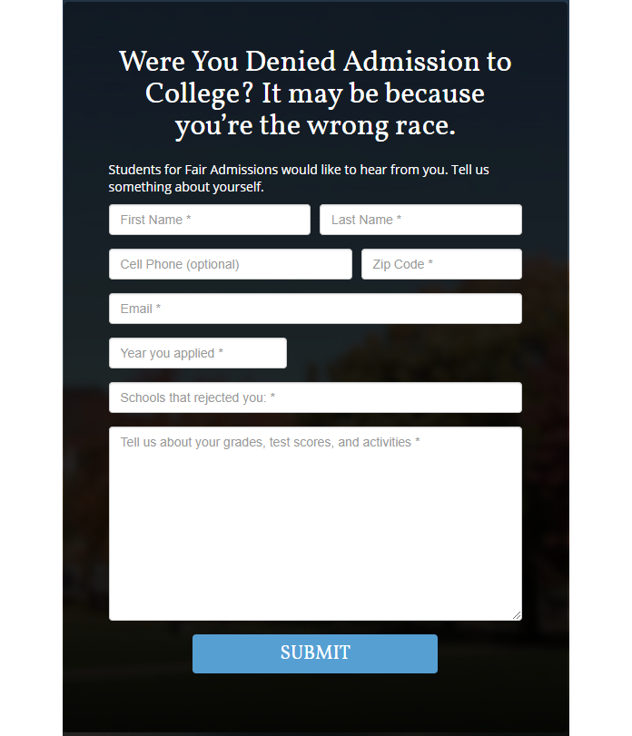 - Plaintiffs: “SFFA argues that Harvard, and ultimately all colleges, should no longer consider race in its admissions process, and that Supreme Court rulings in support of affirmative action have ‘been built on mistakes of fact and law.’”