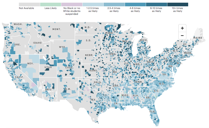 Before talking about the guidance, I want to go to this map from ProPublica’s Miseducation website. I have just a screenshot here, but if you follow the link you can get to the interactive version. Under “measure” you can select “discipline” and then you can see a nationwide map of school districts where Black students are more likely to be suspended than White students. If you have a few minutes, try to find one district where this is “less likely.” (The #s will pop up when you hover over each district.) I’ve spent a decent amount of time with this, and I still haven’t found one district. In the entire country. As I’ve written previously, research points clearly to the harmful and racially disproportionate effects of unconscious bias and exclusionary discipline, and this has real consequences for students, their families and all of us, really.