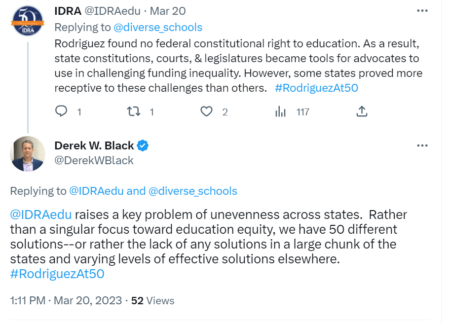 In this short thread, Ary Amerikaner – who is launching a new organization called Brown’s Promise – drew connections between Rodriguez and Milliken v. Bradley, another case with the worst-you-never-heard-of reputation. As she points out, Rodriguez marked a split in litigation strategies: